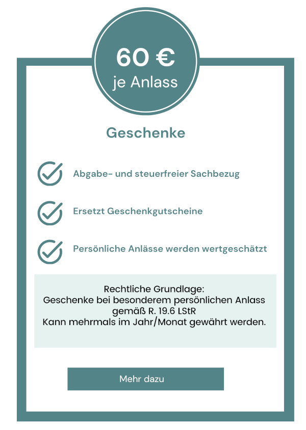 Wählen Sie zwischen verschiedenen Sachbezügen und belohnen Sie Ihre Arbeitnehmer mit verschiedenen materiellen Vorteilen. Im Gegensatz zu einer klassischen Erhöhung des Arbeitslohns profitieren sowohl Arbeitgeber, als auch Arbeitnehmer von der steuerlichen Freigrenze.