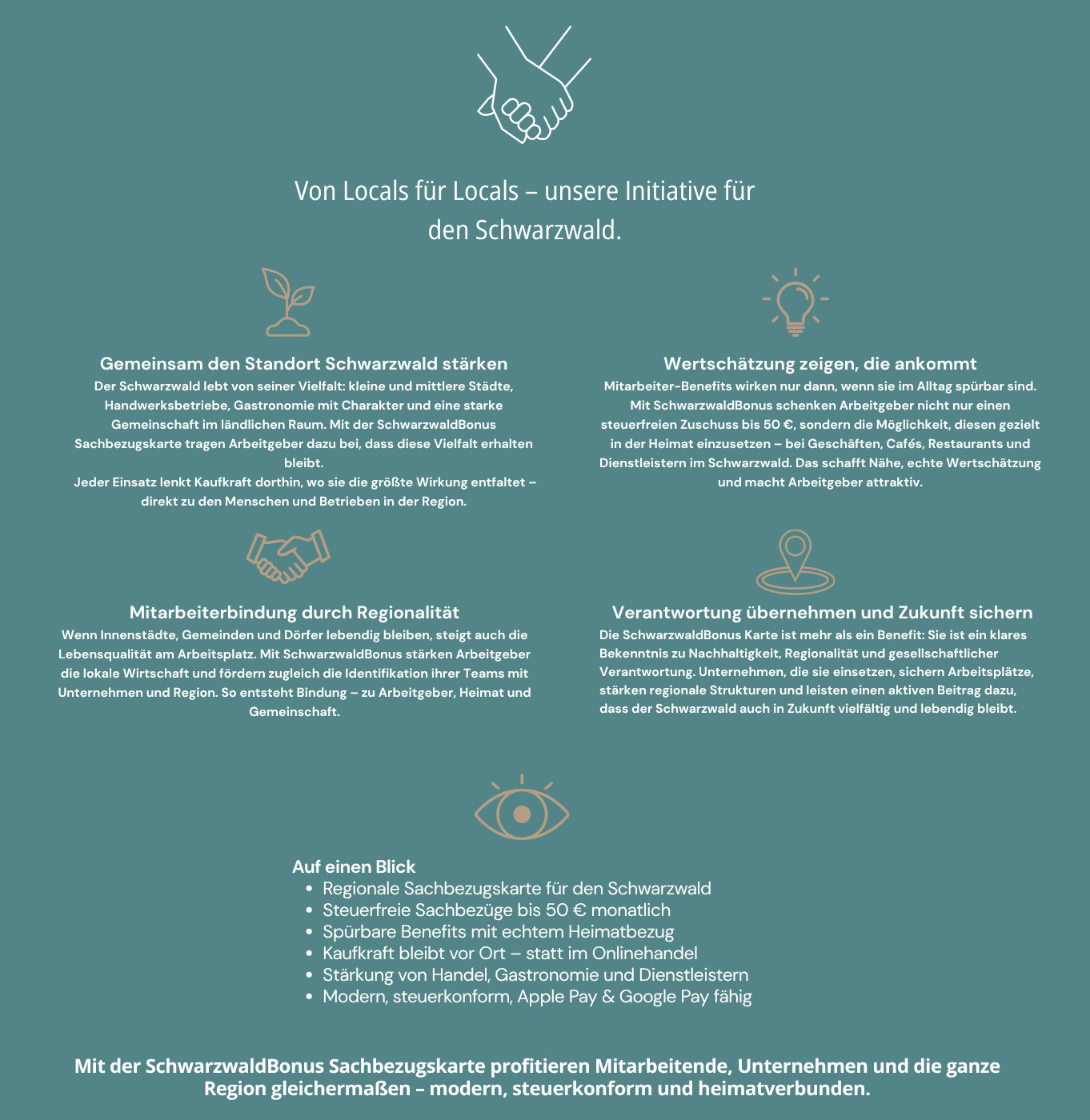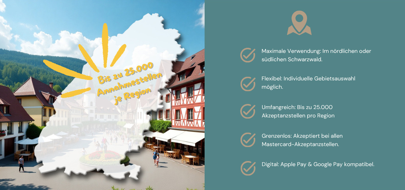 Das regionale Gutscheinsystem SchwarzwaldBonus unterstützt lokale Händler, Dienstleister sowie Gastronomen und sichert somit die Kaufkraft in unserer Heimat – unserem wunderschönen Schwarzwald. Stärken Sie Ihr Team, unterstützen Sie die Region – und nutzen Sie die flexibelste und preisgünstigste Sachbezugskarte am Markt.